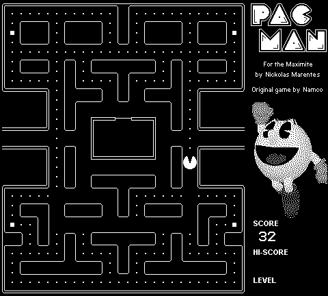 In another subject thread, I asked about whether there was a standard for joystick control on the Maximite. The reason for this was regarding the problems with keyboard control when using INKEY$ in a real-time arcade game application. The problem arises due to the Maximite's use of a keyboard repeat delay and repeat rate. This gives an inconsistent reading if the game requires movement control as a key is being pressed. The key doesn't always deliver the key value, reseting to zero as it pulses to the repeat rate. I have begun writing a version of arcade PACMAN for the Maximite and this was a problem due to the nature of the 4-way keyboard controls in PACMAN. I therefore considered writing it for joystick but I knew it would alienate many users from being able to play the game. I gave it some more thought and have adapted the keyboard logic to compensate for this and succeeded. Below is an image of what I have done so far. The PACMAN character can navigate all around the maze and eat all the dots. The speed and animation (mouth chomping) is just like the original arcade game and the use of an interrupt holds the game at a consistent speed. The game is fast enough so that if I turn off the speed control, the PACMAN moves around the maze as a blur, indicating there is plenty of time left to add the 4 ghosts on the screen and keep a speed that is very close to the original and operating just as smoothly. This is a work-in-progress and I will keep this subject thread up-to-date with my progress.
