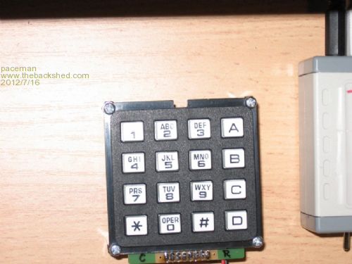 Jez Siddons documented a single analogue input implementation of a 4x3 keypad a few months ago. See the re-posting of it on this forum at: 4x3 Keypad implementation. I decided to try Jez's technique but using a 4x4 keypad to allow some spare keys to use for other functions e.g. menu, delete, navigate etc. The physical setup is shown below and the keypad is a $29 version from Jaycar (I'm sure there are plenty of others available for a lot less than that though).