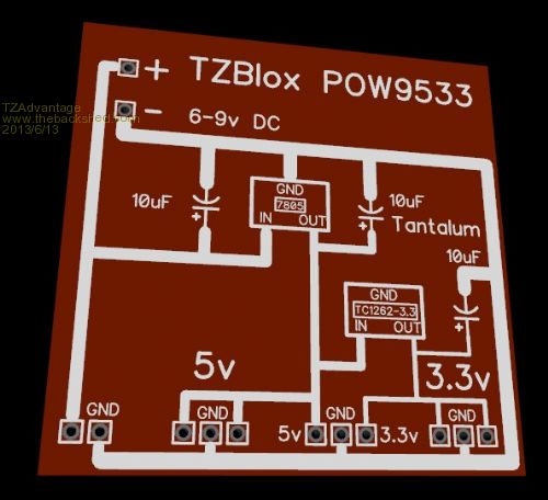 Below is an example of the power 'Block' to get an idea how they will look like. Others like port expanders, digital potentiometers, 7-segment, wifi are also almost done, a few more like EEPROM/RAM/FRAM, servo control, keyboard, bluetooth, RTC, RFID, Joystick, steppermotor, battery pack etc are on the drawing table. It will all be open hard/software and contributions and ideas are very welcome. Most of the communication will be with I2C.