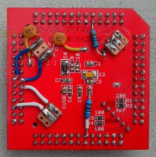 Here’s how the BOB looked after I soldered in the PIC, the support SMD’s, the header pins and my mods.