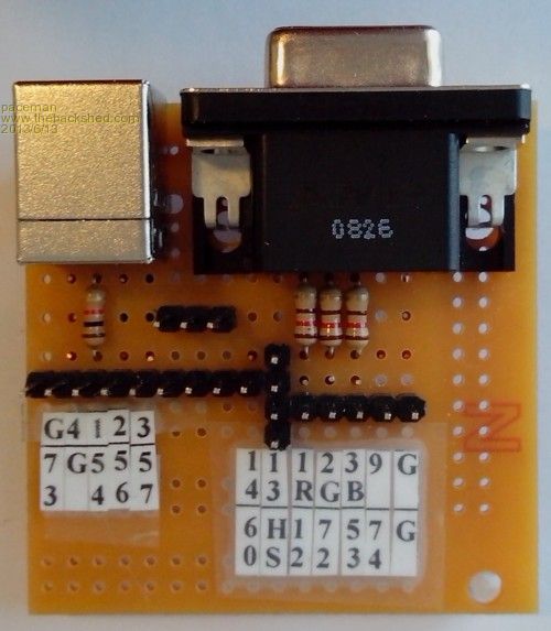 I’ve included a magnified photo to show how I soldered the VGA pin diodes and the series of Gnd connections on the VGA connector. These ground connections were finicky. First I had to drill holes between five of the normal proto board holes to accommodate the offset second row of the VGA pins i.e. pins 6 to 10. Then pins 5,6,7,8,&10 needed to be connected to Gnd but pin 9 (the composite select pin) had to be kept insulated. To do this I cut a V section out of the proto board along the offset middle VGA row. This electrically separated all three rows of the connector and then I looped some bare wire-wrap wire (it had to be fine) along the ground pins at the base of the ‘V’. I threaded a very small length of insulation (off some hookup wire) along this wire to pin 9 to maintain its insulation before I soldered the fine wire to the Gnd pins.