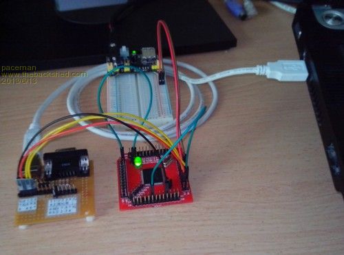 As you can see it has the values for the resistors marked, but not for the capacitors – very helpful, and I couldn’t find any documentation on the ETTEAM site. I Googled around a bit and found this blog PIC32 BOB which also has a link to a schematic giving all the capacitor and resistor values – they’re probably standard off the chip documentation but I wasn’t keen to read through that – yet! From what I can make out it’s pretty much as Geoff has used for the CMM but there are a couple of ‘gotcha’s’ in the connections – more on that below. The infamous 10uF capacitor on the Vcap line is shown as a ‘normal’ tantalum and for that I used a 1206 format 6.3v Jaycar cap I had on hand (P/N RZ6541) which so far has worked fine, although I am a little nervous about the 6.3v limit. I now have some of the low ESR ceramic caps Geoff recommended so if there’s a problem that’ll be the first thing I change!