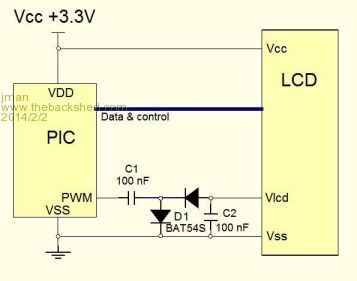 I am not a popular poster around, but from own experience I believe this circuit is a bit pointless and can be significantly optimised. The negative contrast voltage is relative to the power supply and is internally generated. From outside you can do variable contrast by simply connecting Vlcd through 1k (typically) resistor in series to a PWM output. Usually in the devices the LCD contrast is fixed (with 1k to ground) and the backlight is PWM controlled. http://rittle.org -------------- |
