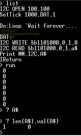 Grogster, val(A$) is 0 because there is not a valid numeric in that variable. You have to format the data from the clock. The data in the time registers is two 4 bit numbers which each have to be converted to decimal and added together. I will post some code when I can find it but I think one of the Johns posted some a couple of days back which will have the details. Bob |