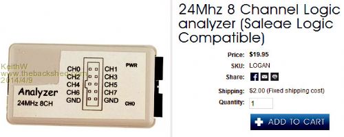 The new Saleaes look pretty good, they will not replace a good scope because they are too slow on the analogue part but for many things (sensors etc) they will be great, I will probably get one (I've had a Logic 8 for a couple of years, fantastic product). But if you need a scope you need a scope, personally I reckon most people working with embedded processors should have both. @Kieth, I see the "Saleae" part of the label has been cut off, that was a but rud eof them I think to actually use the Saleae name on their clone. BTW that Hantek is nowhere near as sensitive as a Rigol, 2mV/div verses 500uV/div, but then it is half the price. Rob Gray, AKA the Graynomad, www.robgray.com |