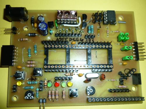 It is a home made 100x75 mm single-sided development board designed to put the PIC18F46K22 on a trial to see how it behaves compared to a Sanguino board. It is still on a "almost ready" state but can be used as it is. I chose to have it instead of a "Sanguino breadboard" style board which, together with a big breadboard would have occupied a lot of space on my small office. It is still missing a 7805 regulator (it powers from USB-to-Serial adapter), a 5v1 Zener diode protection for a resistive divider (measuring up to +55Vcc but is ok if I don't get close to the maximum voltage) and those two trimpots are just for show (not soldered) as they are 100K instead of 10K - one is for testing the ADC, the other is for LCD contrast. It has a PCF8583 as RTC (not tested yet) with two jumpers for 4k7 pull-up resistors and a smd battery socket bellow the board, a serial connection (Arduino standard) with a jumper on VCC and the another on the automatic reset function (which is not used by the actual bootloader, a modified AN1310 serial bootloader who needs a button to enter in boot mode): The taller 3pin female connector (Arduino socket style) is to accommodate an interchangeable IR decoder (for 36, 38 or 40 KHz) and the smaller 3pin female connector is for a Dallas temperature sensor. The longer female connector is for 16x2 LCD display: There are 2 user buttons, 4 user LEDs, a trimpot for ADC testing, a resistive divider for measuring external voltages, an ICSP connector (the black horizontal 6pin female connector): 12 years ago I recovered from a vintage computer board this Bubble Display (3 digits 7 segment) which I had no immediate use for it (not even curious to see the pinout), with the code "HP 5082 7433" It was hard to fit into such a small space and a single-sided design but now is ready to be stressed (datasheet here - and here, you can find a 4 digits one on ebay): Until now, I've tested only the bootloader and did a blink a LED test. Personally, I'm not happy with the final result. Originally, the board was 100x80 mm (the maximum on Eagle Lite) then I had to resize it to 100x75 mm because it was what I had available, then I had to move the peripherals around to make space for the Bubble Display which was a last minute addition (remembered that I had it and I thought it would make a better impression than a single, regular 7seg. digit). All the other male connectors are for connecting the micro pins with the peripherals and also there are two buses (I2C and 1wire). Vasi Hobbit name: Togo Toadfoot of Frogmorton Elvish name: Mablung Miriel Beyound Arduino Lang |