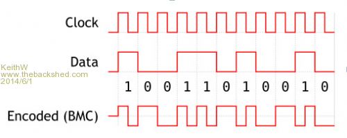 I built a cassette tape system as mentioned by greybeard very many years ago. I think that it used signals somewhat similar to below. Bi-Phase Mark Encoding although it sounds complicated is a relatively simple method for data transmission. It is easy to generate and decode and is used in many applications including the method used to record a Timecode onto professional video and audio recordings, or for recording data on discs and S/PDIF. A very big attribute of this modulation is that a data clock can be derived from the signal. It does not matter if the signal is inverted and it is “non return to zero”, therefore capable of passing easily through analog signal equipment, for Timecode with audio amplifiers and recorders. Using a timer tick for generation of the signal with MMBasic should be OK with a Micromite, and requires little external hardware, just a capacitor to couple the signal if from a Micromite pin to an analog transmitter.