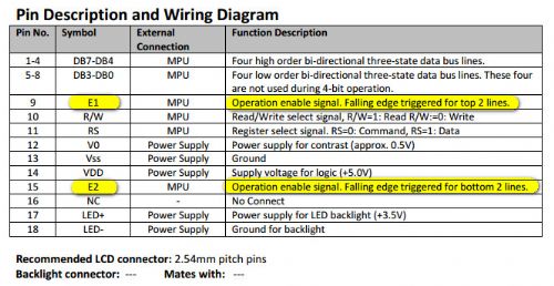 Hi all, trying to implement a 4004 lcd display. Here is the link This display looks like it would work using uMite LCD feature, however the top 2 lines are controlled using E1, which is fine, however the bottom two lines use E2 for enable. Is there a way to implement this using maybe an extra output pin and after the first 80 characters are written, the E2 can be enabled and the balance can be written? Maybe an external logic gate or something? |