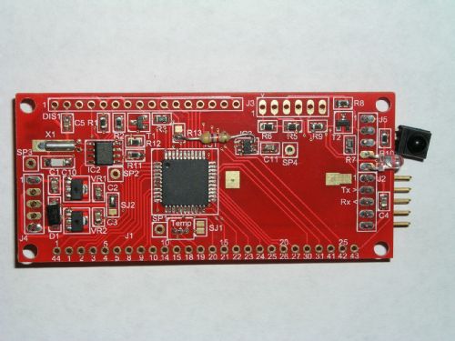 The LCDuMite is a 44 pin MicroMite processor board mounted to a 16x2 blue LCD display module. On the processor board are 5v and 3.3v regulators, protection diode, PCF8563 RTC with battery, MCP4725 DAC, IR receiver and transmitter, 18B20 temperature sensor, PWM backlight control, programming header, console header, power header, and 26 pin header to bring out the remaining processor pins. A third "Sea of Holes" board may be attached for prototypes, or a custom third board for "production" units. The Sea of Holes board has a barrel connector, protection diode and fuse, 8v regulator, and headers to bring up from the processor board: power, 26 unused processor pins, and display pins in case the display is not used.