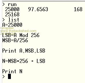 loByte= a MOD 256 hiByte = a\256 PRINT a, loByte, hiByte number = hiByte*256 + loByte PRINT number Jim VK7JH MMedit |