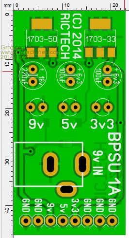 Very small board has 5v and 3v3 regulators on-board. Fed from a 9v regulated plug-pack, and this 9v is also available on the output at the bottom. DC in socket is very close to the output pins for board stability. My first attempt at this board had the DC socket on the top edge, and the PCB was more then twice the size of this one, and the cable from the DC socket would rock the board around on the pins it was plugged into the breadboard.