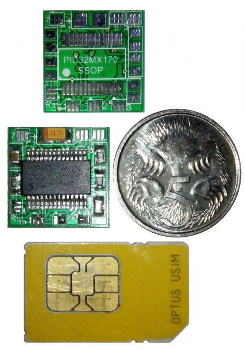 Hi All, MuP-Mini has arrived from The PCB Fab house. I am a bit biased but this board looks absolutely beautiful.. It is 15mm x 15mm square and is considerably smaller than an Australian 5c coin. I havent yet completed the Manual for it so it will be a few days before this project is complete but I have successfully programmed and `flashed an LED' with it. Anyway for what its worth here are the preliminary pictures of MuP-Mini with a 5c coin and a standard SIM for size comparisons..