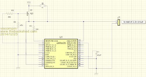 Anyway, using an NPN signal transistor as an emitter-follower to power the uM - that works fine for the low current the uM sucks when running, and although there is a voltage drop across the transistor, it is still within the power supply voltage requirements of the PIC32 chip.