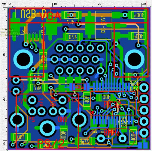 I did not really NEED a VT100 this small, it was just an excuse for me to play with multi-layer. And Shenzhen's PCB prices are just too good for me to not have a play with multi-layer - US$22.90 for ten of these four-layer boards. Having set the PCB size, the mission was "Can I squeeze it all in there?" You would have no hope of doing this module, this small, without going multilayer, I would think.(prove me wrong though!) The PCB size came about based on the VGA socket footprint. It was 31mm wide, so add 1mm and make it square - that was how I came up with the 32mm square size. Smoke makes things work. When the smoke gets out, it stops! |