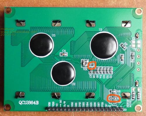 I made one other mod circled in the picture. There is a 2 way shorting link that selects between an external contrast potentiometer and using the on-board one. Changing the link as pictured enabled the on-board one (next to the link).