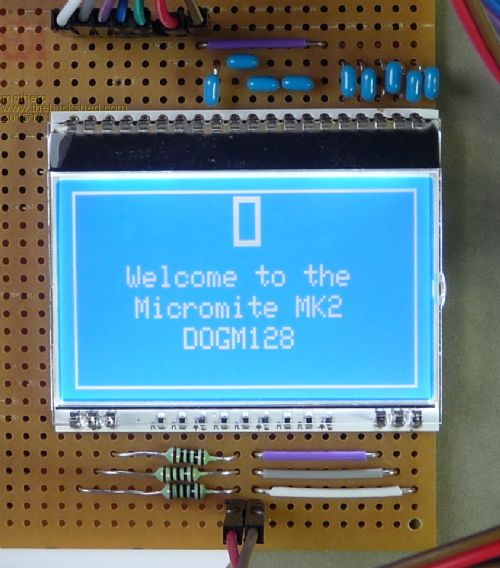 I tried this with a Zolen ZLE12864B which is similar to the DogM128. The ZLE12864B uses the ST7565P controller rather than the "R" version. It ran but the contrast was poor and the screen lost the 8 left bits so when the Hello World screen came up I saw ello World. The ZLE12864B may require a few tweaks to the code to get it working.Edited by micronut 2015-02-05