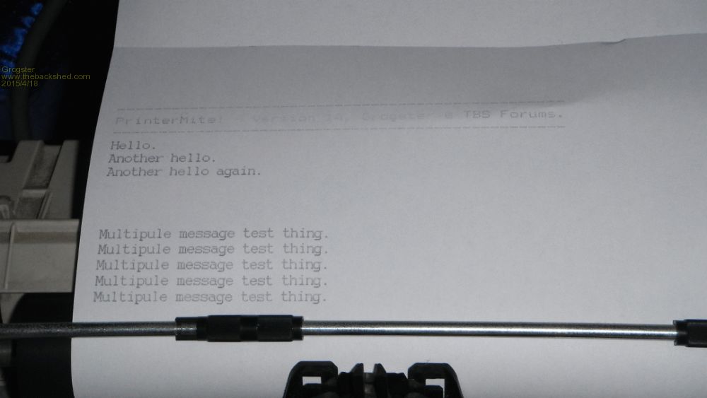 The multipule message test was just the VideoMite sending the same message five times in a for-next, and it was then up to the PrinterMite to decipher the messages and print them out, so this seems to be working at first glance. The tinkering continues...... Smoke makes things work. When the smoke gets out, it stops! |