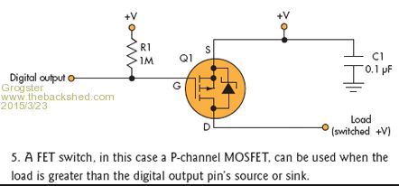 Grogs, I have mentioned before that I have used an opto-coupler to link a mosfet to the pic. Only requires 4 components, 2 resistors opto and mosfet.