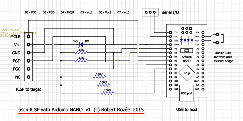 after a few enquiries i've been revisiting earlier work on a cheap ICSP adapter. some of you may have looked at the work darron was doing to use an arduino nano as an ICSP: http://wiki.kewl.org/dokuwiki/projects:nanu-nanu unfortunately darron's solution has a copy of microchip's PE embedded in the nano's code which created some issues with providing a precompiled .hex file that anyone could easily burn. it also has (as far as i can tell) the table of supported devices hardcoded, and the build process to create a .HEX file is pretty much beyond most folks. so, i've created an updated "ascii ICSP" protocol (a variation of 'ascii JTAG' with some extensions), coded it as an arduino sketch, created a .HEX file for upload to a nano, and designed the very simple associated hardware. i've also put together a package containing the bare minimum bits of avrdude to get the .HEX file onto an arduino nano. now i need a few folks to do a bit of beta testing. any volunteers? the hardware is pretty simple - an arduino nano, 5 resistors and a zener diode: