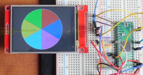 First, many thanks to Geoff for the huge amount of work he has put into the MM2. I'm always amazed at the times (in the UK) at which I receive emails. Geoff is hugely responsive to ideas and with the new facilities in 4.7b8 there is now little or nothing you can't do with a Micromite given a bit of effort. Given the limitations of space on the PIC32MX170, it was not possible for Geoff to include triangle drawing but with the new Cfunction capabilities in 4.7b8 it was trivial to convert drawing code to work as a Cfunction using the MM2's internal routines. This means that the user interface to the Cfunction is much simpler than my old routines. The code below will run on either the 28 or 44-pin chip and any of the three supported displays without any changes (don't forget the ILI9163, it works perfectly). Note that the code doesn't need to know about the pins in use or the display type as this is all taken care of by the MM2 firmware. I've tried to keep the calling sequence to the triangle routine as similar as possible to the internal routines so : funcreturn=triangle(x1,y1,x2,y2,x3,y3,outlinecolour,fillcolour) The only real difference is that the fill colour is a mandatory parameter and should be set to -1 if an outline shape is required. Triangles seem like a fairly useless drawing function but they are actually the basis of all computer 3D-graphics and they allow you to do things like the above. The code for this is : option default none option explicit CPU 48 const stepsize=3 ' this controls the accuracy of the circle segment, small for accurate, bigger for fast timer=0 dim integer radius if mm.hres<=mm.vres then radius=mm.hres/2-5 else radius=mm.vres/2-5 endif segment(mm.hres/2,mm.vres/2,radius,0,60, RGB(red)) segment(mm.hres/2,mm.vres/2,radius,60,120, RGB(Blue)) segment(mm.hres/2,mm.vres/2,radius,120,180, RGB(magenta)) segment(mm.hres/2,mm.vres/2,radius,180,240, RGB(cyan)) segment(mm.hres/2,mm.vres/2,radius,240,300, RGB(yellow)) segment(mm.hres/2,mm.vres/2,radius,300,360, RGB(green)) segment(mm.hres/2,mm.vres/2,radius,60,60,0) segment(mm.hres/2,mm.vres/2,radius,120,120,0) segment(mm.hres/2,mm.vres/2,radius,180,180,0) segment(mm.hres/2,mm.vres/2,radius,240,240,0) segment(mm.hres/2,mm.vres/2,radius,300,300,0) segment(mm.hres/2,mm.vres/2,radius,360,360,0) circle mm.hres/2,mm.vres/2,radius print timer end ' ' Routine to draw a segment of a circle ' Parameters are: ' x-coordinate of centre of circle ' y-coordinate of centre of circle ' radius of circle ' start radial of segment to be drawn (0-360 degrees) ' end radial of segment to be drawn (0-360 degrees) ' colour to draw segment ' ' NB if start radial and end radioal are the same a line will be drawn ' sub segment(x as integer, y as integer, size as integer, startradial as integer, endradial as integer, colour as integer) local integer i,j,x1,x2,y1,y2,sr,er if startradial=endradial then x2=sin(rad(startradial))*size + x y2=-cos(rad(startradial))*size + y line x,y,x2,y2,,colour else IF startradial<endradial then sr=startradial er=endradial else er=startradial sr=endradial endif for i=sr+stepsize to er step stepsize x2=sin(rad(i))*size + x y2=-cos(rad(i))*size + y x1=sin(rad(i-stepsize))*size + x y1=-cos(rad(i-stepsize))*size + y j=triangle(x1,y1,x2,y2,x,y,colour,colour) next i endif end sub ' ' Routine to draw a triangle ' ' Parameters are: ' x-coordinate of first point ' y-coordinate of first point ' x-coordinate of second point ' y-coordinate of second point ' x-coordinate of third point ' y-coordinate of third point ' colour to draw triangle outline ' colour to fill triangle use -1 for outline only ' CFunction triangle 00000000 27bdffa0 afb40048 8fb4007c 8ce90000 8e820000 afa50064 8fa30064 afa60068 afa7006c 8fa70070 afa40060 8c850000 8c660000 8fa40068 8fa30074 8ce80000 2407ffff afbe0058 afb70054 8c9e0000 8c770000 afbf005c afb60050 afb5004c afb30044 afb20040 afb1003c afb00038 00401821 104700f4 8e840004 0126202a afa60020 afa90018 10800005 00a09821 03c09821 afa90020 afa60018 00a0f021 8fa50018 02e5202a 10800006 afa80024 03c02021 afb70018 0100f021 00a0b821 afa40024 8fa60020 8fa70018 00e6202a 148000ac 02602021 8fa40020 509700b0 03d3182a 8fa70018 10f70002 8fa60018 24e6ffff 8fa90020 00c9202a 148000e1 8fa70024 8fa20018 03d32823 00f32023 0049b023 02e9a823 afbe0028 afb7002c afb4001c 01208021 00009021 00008821 3c029d00 00a0b821 0080f021 10000003 00c0a021 8fa4001c 8c830000 0236001a 02c001f4 02002821 02003821 02378821 26100001 00002012 0255001a 02a001f4 00932021 00804021 00003012 00d33021 00c4482a 11200003 025e9021 00c02021 01003021 afa30010 8c430048 0060f809 afa20030 0290182a 1060ffe6 8fa20030 8fb4001c 8fbe0028 8e830000 8fb7002c 00601021 02f0202a 148000ab 8fa70018 8fa50024 8fa90020 00b3b023 00be3023 02079023 02098823 02e92023 72368802 afb40018 afa6001c 02c0a021 72469002 0260b021 02e7a823 3c029d00 10000003 00809821 8fa40018 8c830000 0255001a 02a001f4 8fa6001c 02002821 02469021 02003821 26100001 00002012 0233001a 026001f4 009e2021 00804021 00003012 00d63021 00c4482a 11200003 02348821 00c02021 01003021 afa30010 8c430048 0060f809 afa20030 02f0182a 1060ffe5 8fa20030 8fb40018 8e830000 8e840004 8fa50078 8ca20000 1043005d 8ca50004 8fa3006c 8fa60060 8fa70064 8fa90068 24110001 8cc40000 8ce50000 8d260000 8c670000 3c109d00 afb10010 afa20014 8e020050 0040f809 00000000 8fa40078 8fa50068 8c820000 8fa6006c 8fa70070 8fa90074 8ca40000 8cc50000 8ce60000 8d270000 afb10010 afa20014 8e020050 0040f809 00000000 8fa30078 8fa50070 8c620000 8fa60074 8fa70060 8fa90064 8ca40000 8cc50000 8ce60000 8d270000 afb10010 afa20014 8e020050 0040f809 00000000 8fbf005c 8fbe0058 8fb70054 8fb60050 8fb5004c 8fb40048 8fb30044 8fb20040 8fb1003c 8fb00038 03e00008 27bd0060 afa70020 03c09821 0080f021 8fa40020 1497ff53 afa60018 03d3182a 1460002d 8fa50024 027e182a 14600030 03c03821 02603821 02602021 8fa50024 00a4182a 54600003 8fa40024 00e5182a 00a3380b 8fa60020 afa20010 3c029d00 00e63821 8c420048 00c02821 00e43823 0040f809 00803021 8fa50078 8e830000 8ca20000 8e840004 1443ffa5 8ca50004 54a4ffa4 8