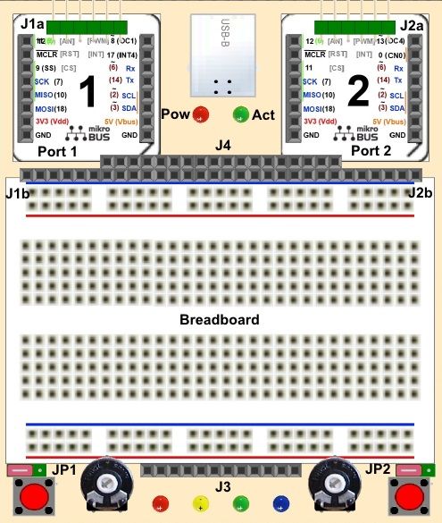 J3 provides the Minimum I/O accessory's needed in every project, two push buttons, two POT's and four LED's. JP1 and JP2 are used to set PB1 and PB2 as active Low or active high. J3 also routes Gnd, 3V3 and 5V power connections to the bottom of the breadboard to eliminate the need for long bridge links (as seen in the photo's) and facilitate split power buses.