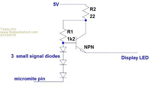 With the values shown, the maximum LED current was ~10mA. This was as bright as I wanted but I think the 22 ohm should be less and probably the 1.2k as well. I also think that 2 diodes would work without any risk to the micromite pin. I need to do a breadboard and run some more tests. I would also put the 22 ohm resistor after the transistor but the board layout didn't suit - but that might mean I do need the three diodes for switching ON. Jim VK7JH MMedit |