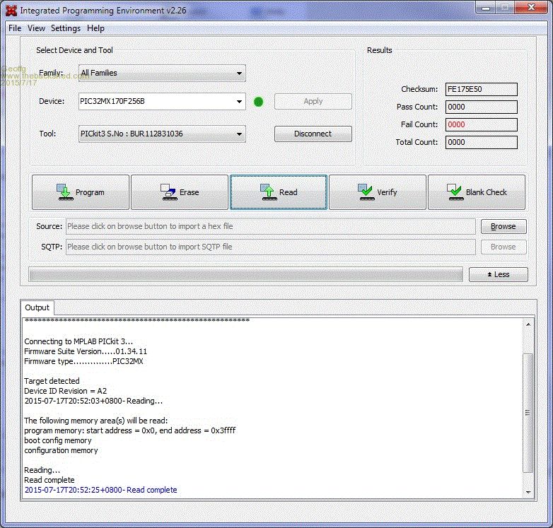 Hello, I have a pic32mx170f256b that I have a mmbasic program on. I want to read the chip with the pickit 3 and create a hex file with mmbasic and my program so that I can program another 170 with mmbasic AND my program at one time. I hooked up my pickit 3, loaded mmbasic, fired up mmedit and loaded my program. All is good...