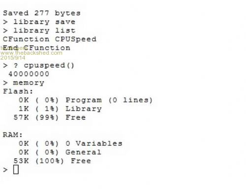 spotted a small error in the manual, where reference is made to DS1703 instead of DS1307 in several places. and i see a factory reset does clear the library contents - is this as intended? given that there is a LIBRARY LIST command, that lists the basic statements in the library but not cfunction contents, how practical would it be to include reconstruction of the cfunction source? and, if this were possible, would it then be viable to consider adding in a LIBRARY EDIT command? or am i looking too far ahead! cheers, rob :-) |