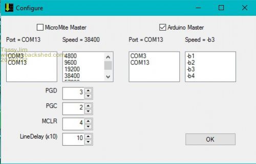 For Micromites, select the com port and baud rate that it is currently set at. The baud rate gets changed to 115200 during programming. You also need to set the pins that are used for the 3 functions PGD, PGC and MCLR. The line delay is needed during uploading the program. 10 (100ms) is the minimum that works reliably. For Arduino, usually the only setting is com port. -b3 is the most common setting for baud rates but you may have to try other settings. The settings are saved between sessions. Programming the Master PIC