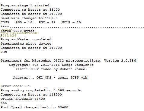 Jim, An update. I started a fresh setting baudrate to 38400 and all worked this time. I was sure I did that before but may not of as I usually run at 115200. Now there is an error code: 1 See below Program Master completed Program stage 1 started Connected to Master at 38400 > OPTION BAUDRATE 115200 Connected to Master at 115200 Baud Rate changed to 115200 COM4 PGD = 25 : PGC = 24 : MCLR = 26 ****................................................... Saved 6609 bytes > Program Master completed Programming slave device Connected to Master at 115200 RUN Programmer for Microchip PIC32 microcontrollers, Version 2.0.186 Copyright: (C) 2011-2015 Serge Vakulenko (ascii ICSP coded by Robert Rozee) Adapter: . OK1 OK2 - ascii ICSP v1M Processor: MX170F256B Flash memory: 256 kbytes Boot memory: 3 kbytes Data: 491700 bytes total TDI/TMS pairs sent = 151 pairs total TDO bits received = 72 bits total ascii codes sent = 73 total ascii codes recv = 27 maximum continuous write = 24 chars O/S serial writes = 9 O/S serial reads (data) = 3 O/S serial reads (sync) = 0 XferFastData count = 0 10mS delays (E/X/R) = 0/0/0 elapsed programming time = 0m 00s Error code: 1 Programming completed in 0.917 seconds Connected to Master at 115200 OPTION BAUDRATE 38400 ààà Port Speed changed back to 38400 Rob White |