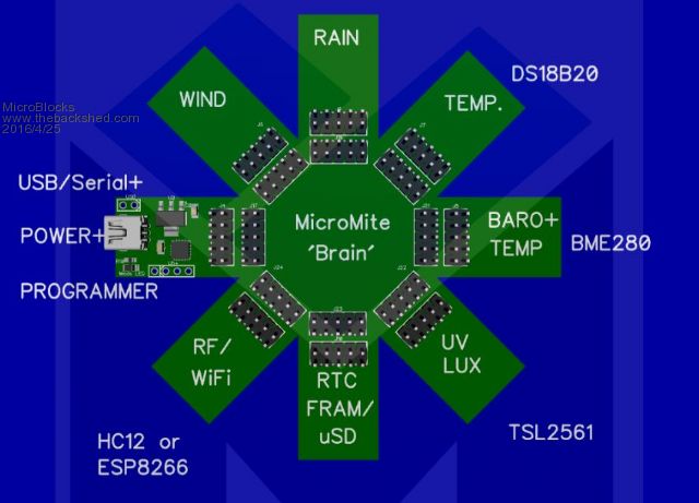 The center is a uMite (28/44/64 has to be decided) The left is my USB/Serial/Power(3.3v,5v max 500ma)/Programmer module. The rest of the 'leafs' are for the sensors, logging and communication. To place the sensors on the best location you can cut of a leaf and use a ribbon cable to connect it to the center 'Brain'. If it is not separated then no headers are needed as the connection will be made with traces on the PCB. I wrote in each leaf what its function will be and if known i also noted the specific part. This is all early and things will change, hopefully with your input. My intention is to open source it with a schematic and a set of gerber files. I also plan to offer it as a bare pcb, a full kit, kit with smd assembled and also fully assembled. Prices are at this stage unknown as not all parts are known. An indoor unit is under consideration, it will probably be a uMite with a LCD and maybe some extra visual/audio capabilities. Microblocks. Build with logic. |