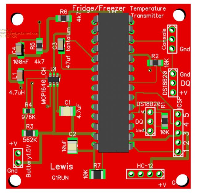 This is what my outdoor unit looks like - it's a 3d model at the moment, I've got to get the smd's soldered onto the board as my eyesight and hands won't let me solder things that small unfortunately It's 75mm X 75MM, I did make it 50 X 50 but it really was too small. I could have made it smaller by using the smd version of the micromite but I didn't see the need to have it too small The ESP8266 isn't needed on the outdoor unit, I included it so I can reprogram the micromite remotely in case better software than I can write becomes available, or in case someone modifies it so it runs much better, or indeed to add new features It will be powered by a 3.7V -5V solar charged battery. Here's the indoor unit, it's designed to fit on the back of a 7" touchscreen lcd display I have done a smaller board for the smaller lcd's as well but I won't put it here yet. I've also done a fridge/freezer board, I have a fridge and 2 freezers and I was thinking of making use of the lcd display so I thought why not monitor the temperatures of them and display it on the lcd, it can have a warning so if the temp goes too high or the power fails for some reason it will flash a warning on the lcd in big red letters. A gimmick really I guess, but I had free space on the lcd display so I thought "why not" It works off a 1.5V battery and communicates via a 433Mhz low power transmitter it's 50mm X 50mm Again they are only 3d previews, I have the boards but have to wait to get someone to solder them for me |