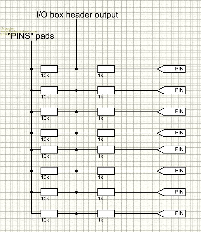EDIT: There might be a small problem when used as outputs. Even with no solder-blobs, up to 8 pins will still be connected via the 10k arrays in a series circuit arrangement, so I will have to have a bit more of a think about that. IE: Any group of 8 pins, even with the blobs not there, will still have series 10k's to each other for each group of 8. A little hiccup there, as a result of my changing the design half way through. It seemed like a good idea at the time!
