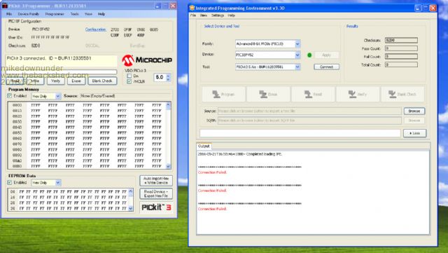 Hi All. I recently purchased some PIC 32MX170F256B's but for some reason I am unable to connect to them. I have been program various PIC's for a number of years using a genuine PICkit3 and have not had any problems. I originally used the PICkit3 apllication V3.10.00 from Microchip, but when I tried programming the PIC32's today I couldn't get anything working even though I could connect to a PIC18F452 a PIC18F25K22 and also a couple of 16F devices with no problems. Also I have the PIC 32's on a breadboard and the Micromite MK2 backpack but still cannot connect. I then went to the forum and did a search and found mention of the MPLAB IPE. I downloaded and installed both the IDE and the IPE but could not connect to anything!!! I have tried various ways of connecting. i.e. Using my USB hub and also plugging straight into a PC USB. With external power applied and not applied. Also using a PC running XP and my new one running WIN 10. Please see the 2 IPE's in this picture.