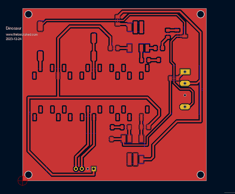 Hi, First time poster but have been using KICAD for over 10 years but I'm nowhere near an expert. I'm currently running on Linux Mint using the KICAD snap package and its all going good if that's any help for Debian. For a single layer board with components on the top and tracks on the bottom your plot looks fine. You are correct that, by default, the PCB is viewed from the top down as if the board were made of glass. In version 7 the default top copper track (F.Cu for front copper) layer is shown in red and the back (B.Cu for back copper) tracks are in blue. Anything that has both top and bottom copper will be yellow. As your using the library footprints and they have been designed for two layer boards they have both top and bottom copper tracks and so the through hole pads are all yellow. If you produce a single (bottom only) layer board then you just need to use the B.Cu layer gerber file. If you wanted you can use the board setup (PCB icon on the tool bar next to the floppy save icon) to remove the top layers in the board stack up but I don't think its worth it. You would normally produce gerber files for PCB manufacture by using the plot icon where the popup window allows you to select the layers you what. KICAD will produce a file for each layer - a layer being effectively a separate PCB manufacturing process so there's a front silk screen file, front solder mask file, a back copper file and so forth. You have to click on a separate button in the popup to produce the drill file. I have never used isolation routing, but when I have used a router to produce mechanical parts I have created the tool path gcode from a DXF file using a CAM program (ESTLCAM in my case). KICAD can directly output (plot in KICAD-ees) DXF files (and SVG files). When you click the plot icon; at the top left of the plot pop up window it says plot format with a drop down box. By default its set to gerber, but clicking on the drop down you can select DXF or SVG (among others). I would expect - again I haven't tried this directly - that the DXF plot could be loaded into the CAM software and a track outline selected as an 'on the line' route path to produce an isolation cut. The DXF would be as you see it on the screen so would need to be mirrored before you do the routing as you will be cutting with the bottom of the board upper most. I think ESTLCAM can flip the DXF file on import but as I say I have not done isolation routing as I go the gerber, zip file SEEED Studio / PCBWay / JLBPCB etc path (all not sponsored - I use SEEED around 5 to 7 times a year for different jobs and they have never let me down. That's just fact, not an advertisement!). It looks like your board is under 100mm square so you could get 10 for US$5 plus shipping from SEEED. The shipping is way more that the cost of the board production in my experience. BTW there is an option in the plot pop up window to mirror the output if you select a SVG file if that helps any? I hope this (apparently rather long) ramble helps out. All the best from WA. Everything here has been Sun Baked in WA |