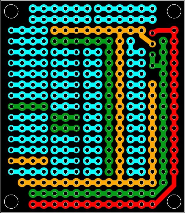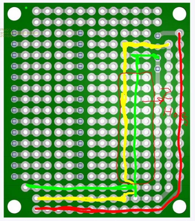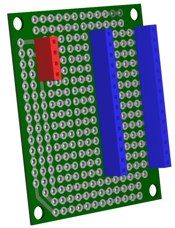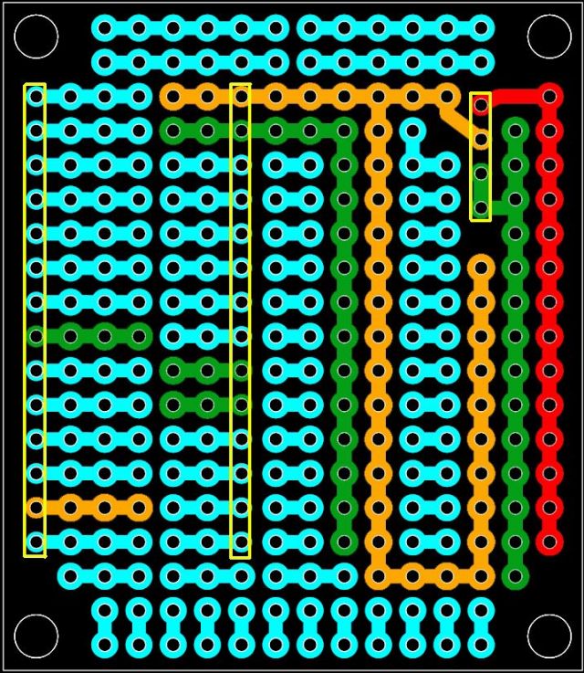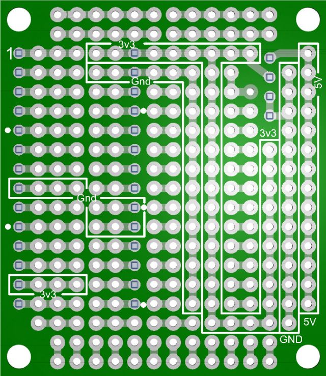 The 3v3 appears to be split in 2 but in fact they will connect once plugged into MuP. I have never used this style of prototyping before as I have always used the `sea of holes' type but I can see some merit in it.