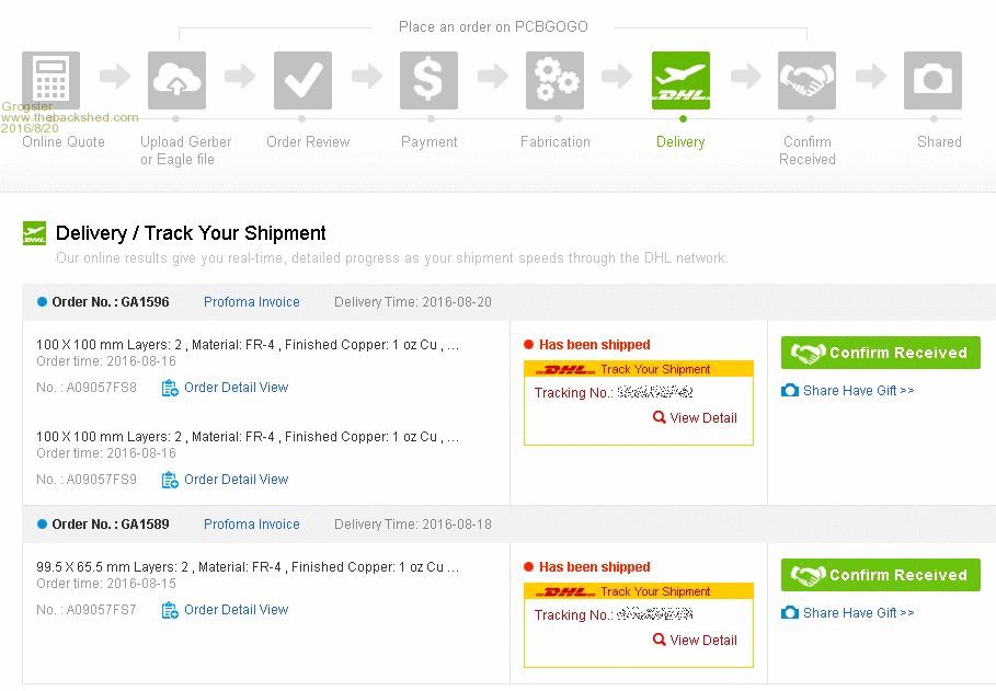 PCB GOGO's website also gives you the DHL tracking numbers for your orders, and you just have to click the "View detail" hyperlink in the DHL box, and it will take you over to the DHL site and bring up the tracking information for you - dead easy, and you don't even have to copy-and-paste the tracking number.