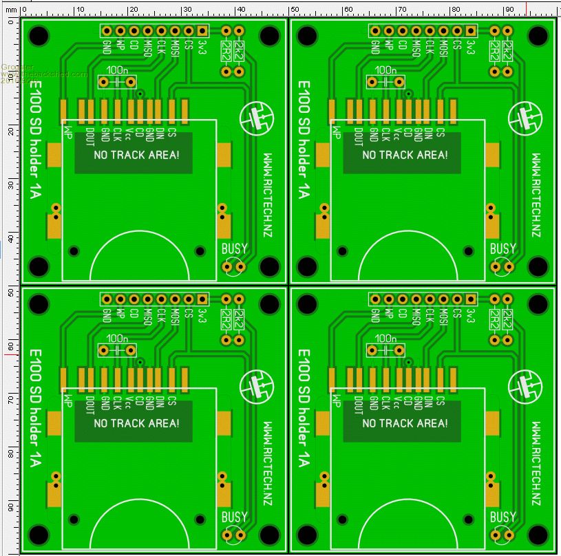 In the above image, note that the OUTLINE layer defines the four separate boards on the 100x100 panel, with the dividing lines being at 50mm horizontal and 50mm vertical.