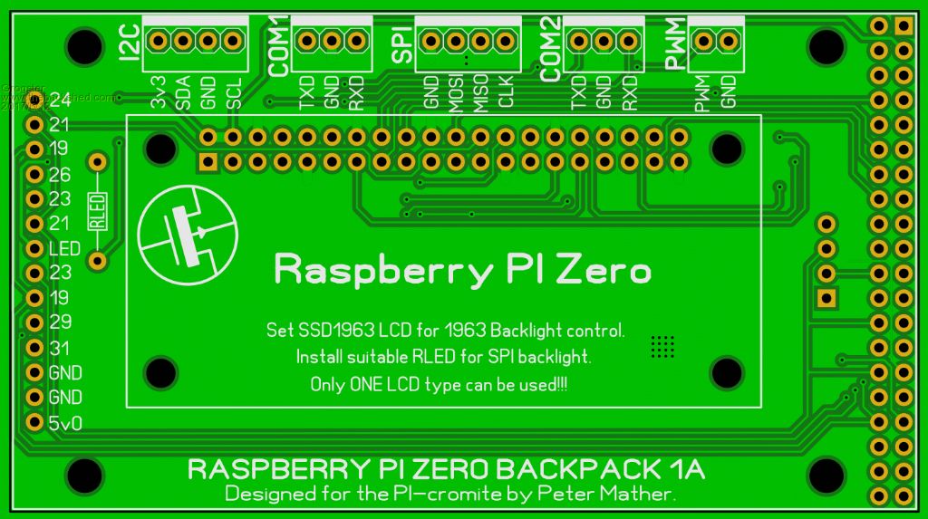 All other pins are as already stated. You can use either a 2.8" SPI LCD with touch, or ANY supported SSD1963 LCD with SPI touch and SD card. For the latter, you don't fit the SPI LCD, and instead plug the PI-zero board directly onto the pin-header on the 1963 LCD module of choice. You would need some self-adhesive PCB supports for the arse-end of the PI-zero board, to stop it flapping around on the LCD header, but that is dead-easy to do.Edited by Grogster 2017-06-13