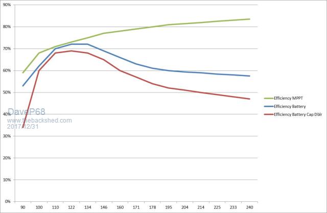 Here is a graph of an F&P stator’s efficiency in 3 different modes, MPPT (GTI), Battery Charging and Battery charging using a Capacitor Doubler.