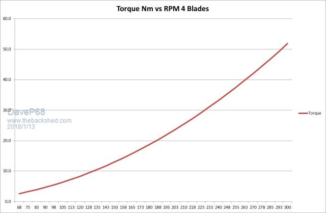 For those interested plotted 3 graphs of projected Torque vs RPM for 2, 3 & 4 bladed wind turbines all with a TSR of 5.7, so wind speed will directly proportional to RPM if TSR is kept constant. Wind speed range is from just under 2.5 m/s to just over 10 m/s.