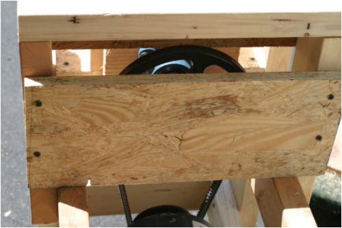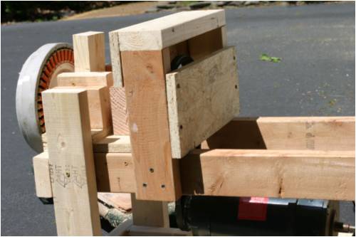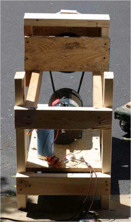 The bench is solid 2x4 and 2x8 construction. The motor is 1.5hp dc motor. The pulleys give a 2:1 gear reduction. There is a cage to trap the big flywheel in case it comes off. I used two 25A rectifiers to split the AC current so they don't overheat. They each see about 10A when I'm maxed out on my variac to the motor at 140v. Two capacitors filter the rectified voltage. I use a frequency counter on my multimeter connected to two of the phases. 28 hz equals on revolution/second. Two other multimeters measure current and voltage. Graph will follow shortly.