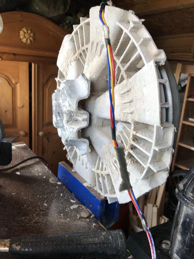 I have taken a Fisher Paykel motor out of a washing machine. It is a 36 pole version. I have rewired it to 3 x 4C as per the great diagrams on this site. I have cut back the parts of the washing machine housing and am still using the original hub from the washing machine.