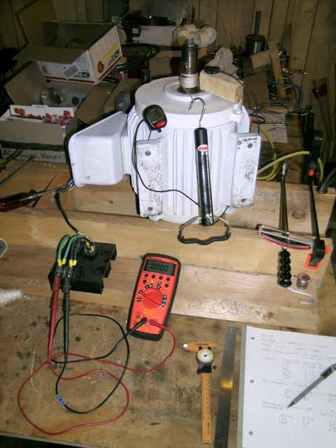 In my photograph above, I show all the materials I used to test the Toshiba conversion. At the lower left, you can see the black heat-sink that holds some little rectifiers - the measured output is DC. On the shaft, I have wound a string a few dozen times. Hooked on the string is a scale. Also beside the shaft is a bicycle speedometer, which I use as a RPM counter. The display is on the left of the shaft and the sensor is on the right side of the shaft. The multimeter reads the DC voltage only - the whole test is conducted open-circuit.