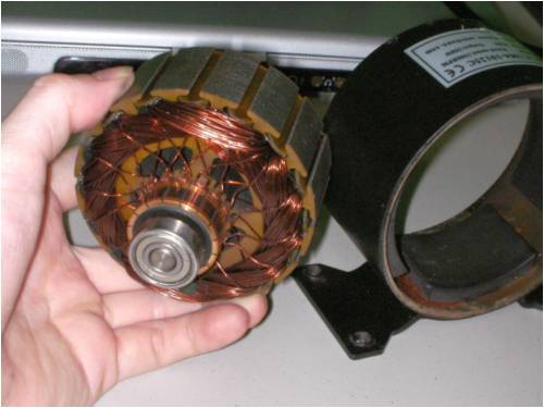 I've opened up my MY1018 motor (24V scooter motor, 250W, 2750 RPM, 14A) a few days ago after your previous question. Turned out mine has a burned winding, after a magnet came off. I reglued the magnet about 2 years ago but the motor *needs* a rewind to be usable again. I've considered doing something else to it, turning it into an 'outrunner', where the rotor (the part you're holding in your hand) would become stationary and a new permanent-magnet (PM) rotor with neos would rotate. However, I've decided not to: the rotor has 16 teeth, so it 's practically impossible to rewind to 3-phase. But I digress. Back to your question: Yes, you can rewind. 10W is a very reasonable amount of power, considering that your motor was originally rated at 250-300 W. First, you have to decide on a cut-in speed; the speed (RPM) at which your generator should start charging the battery. You don't want it too high (as you don't want your genny to only work in a hurricane) and you don't want the cut-in speed to be too low, as that may 'stall' the blades. To muddle the waters a bit more, cut-in RPM is also related to windspeed, blade diameter and TSR (tip-speed ratio). Let's assume you will build a blade with about 0.7-1 m diameter, that you want to charge a 12V battery and that you want cut-in to happen at 300 RPM (somebody, if my figures are off please correct me.) The motor as-is now yields 2V at 200 RPM. We want 12.5V (the voltage at which the genny should 'cut-in', i.e. start charging) at 300 RPM. Current volts/RPM is 2/200=0.01 V/RPM Desired volts/RPM is 12.5/300 = 0.042 V/RPM So in the new situation your rotor will need 0.042/0.01 = 4.2 times as many turns than it has now. Next thing to do: unwind the rotor, carefully making notes of which coil is connected to which commutator bar. Make as many notes of every detail as you can, with drawings/sketches. Make some pictures too, you'll thank yourself later when you want to check your work. Unwind the rotor and count the amount of turns per slot. Save the epoxy 'strips' that close off the rotorslots, you will need to install them again after the rewind is finished. Then, measure wire diameter (in my motor it was 0.6 mm, including enamel); yours may be slightly different. You will be putting 4.2 times as many turns in there, so to make all that extra wire fit you will need to use thinner wire. The diameter should be roughly half (square-root of 4.2 =~2), so about 0.3 mm (including enamel), perhaps 0.25 mm even to make sure it all fits. Then, rewind, using the notes you've made. I've never actually done this myself to such a motor. Definitely read the links to Fungus' rewind attempt I gave in a previous reply. After the rewinding the rotor will need to be 'varnished' in motor varnish or epoxy, to make sure the wires won't vibrate and damage their insulation during use. This step is as important as the actual rewinding. This video gives an idea as to how much movement there can be on those windings: http://www.youtube.com/watch?v=lPNU2vniUIc&feature=related Rewinding isn't rocket science, it's not hard to do, just a lot of work. Pay attention to detail, don't rush it, and after a few hours you should end up with a rotor with the desired voltage/RPM characteristics. As stated in your previous thread, the issue with the brushes and the small bearings (I re-checked, definitely 608 ones in mine) remains. However, that has nothing to do with the technical feasability of rewinding. I'd give it a go if I were you. In fact, I may just rewind my motor myself when I'm bored enough someday.