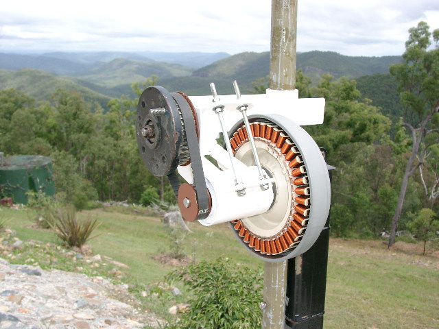 Yes, I still think that was a good idea and it worked well til it must have become a little loose and in a storm it must have been producing so much power it jumped a few cogs in one of the gears and from there on stripped the rubber and fibre webbing from the belt ... Just looked up my diary from 22-7-08. 845 watts in to a 48v battery bank with 100 S stator and a retrofitted Neo magnet rotor. They were the ABS pipe blades that Phill and I made back then ,,since broken in a huge storm . as Tony says ,,sh*t happens,, but nowdays ,I'm sort of into bigger commercial machines like my Exmork.. Regards Bruce Bushboy |