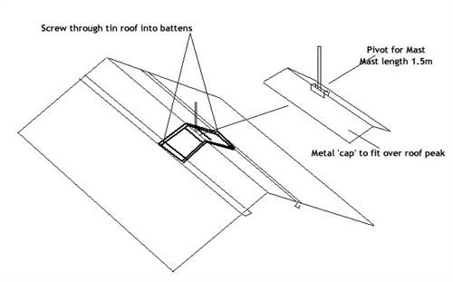 I have thought of a possible mounting solution, being a brace that 'folds' over the peak of the roof, and is screwed into the battens. A VERY short (1.5m or less) pole would have the turbine mounted on it.