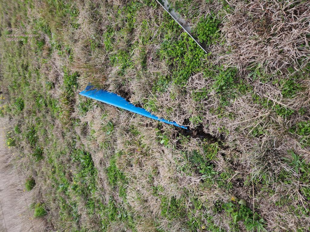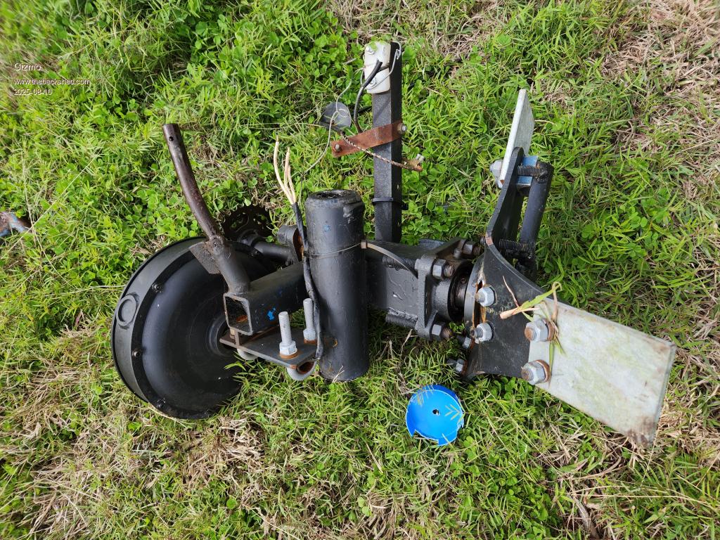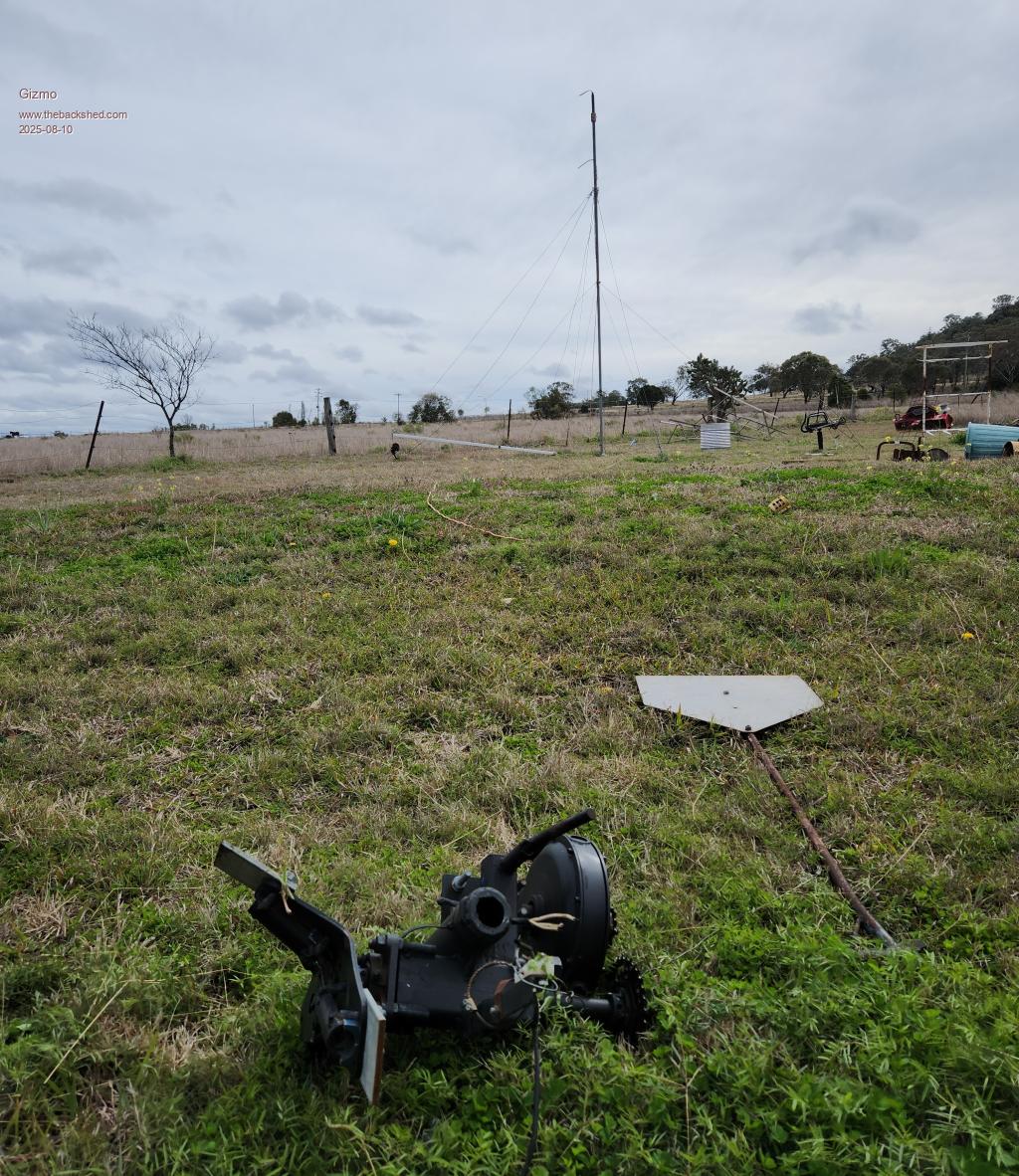 The level of destruction is impressive. First, the nacelle is secured over the top of the tower by a couple 8mm bolts, the pull cable, and electrical cables, all sheared off. Bits of this are spread all over the place. All 3 blades exited the hub, I've found 2 embedded into the ground, one is still missing, and I've walked the paddock in every direction for 200 meters looking for it. Even one of the guy wires for the tower was torn off, but a backup cable kept the tower up.