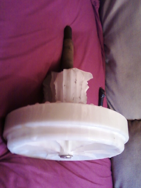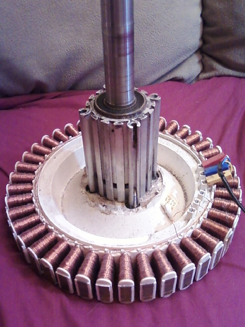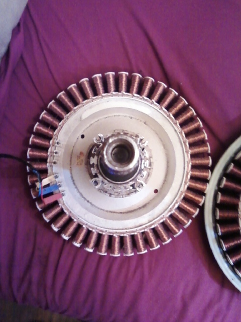 This pic shows more of the coils on the F&P but, mostly gives a good shot of the alluminum housing I kept from the washer tub. I cut this from the tub with a sawzall and then removed the bearings and melted the plastic off. You can see the center of the hub has had the tabs broken off. I did this to play with the idea of off setting this coil pack with another one on the other side of the shaft.