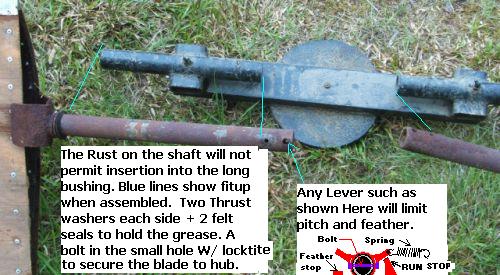 Pukwudji Below is the Pic's. of a long abandoned project I had built it to allow the pitch to feather in high wind but never got to test any part of it. A fluid shock absorber should be added to this to dampen the effect of gusting wind and flutter. This mill was built to drive an auto air conditioner compressor in the winter to heat water as a supplement to home heating, I figgered the Heat equalivent of 3 watts to 1 watt electrical would make the mill much more efficient than it would ever be as a generator.
